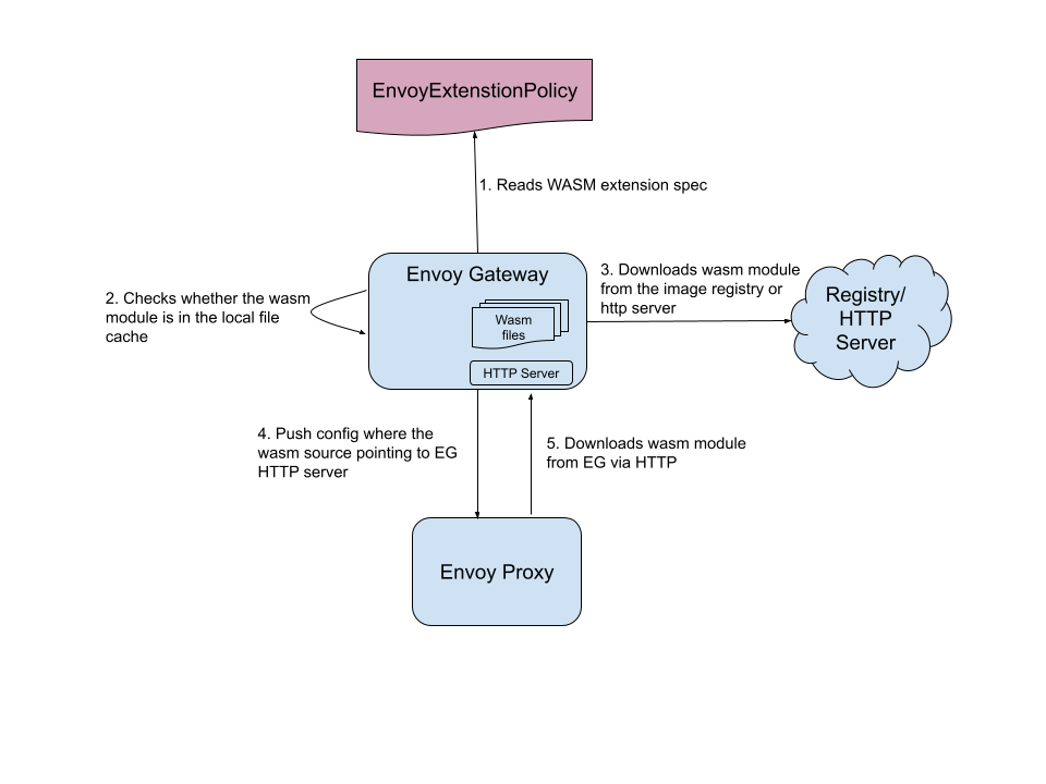 Envoy lacks native OCI image support, therefore, EG needs to download Wasm modules from their original OIC registries, cache them locally in the file system, and serve them to Envoy over HTTP.